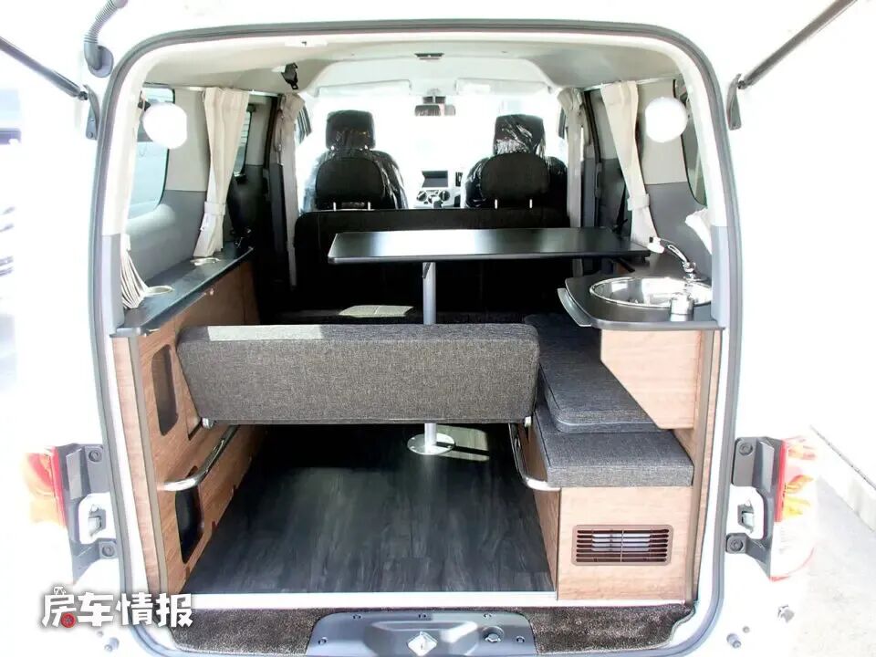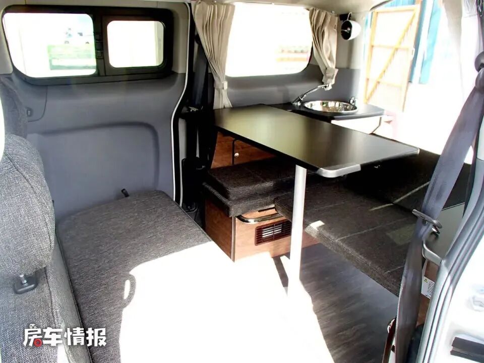当晚上需要休息的时候,可以将餐桌移走,把前后的座椅相互拼接,组合成一张可以容纳两个人使用的沙发床。