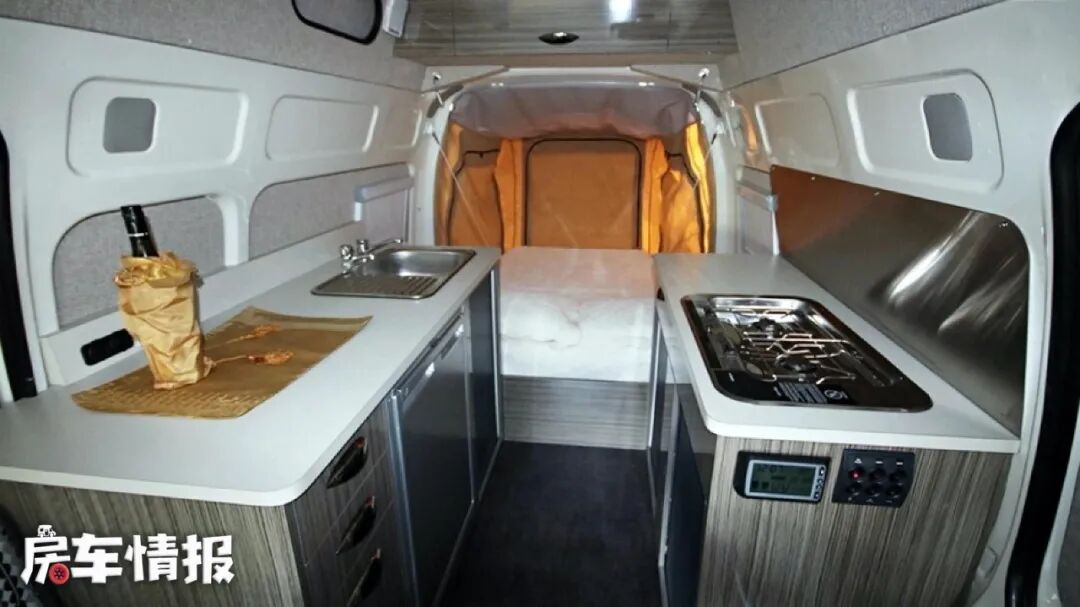 厨房分列车内两侧,而不是紧凑的单面厨房区,提供了足够的柜台空间,乘客侧的双燃烧器炉灶和驾驶员侧的水槽以及110升冰箱共同构成了露营车内的厨房,给热爱烹饪的朋友们留下大展身手的空间。