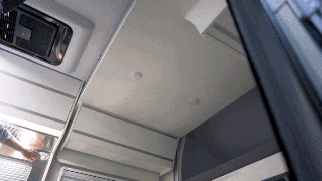 进入车厢内部可以看到车内的空间整体表现略显紧凑,不过合理的布局对于日常使用来说还是没有问题的。驾驶室顶部依然提供了一个额头床区域,不过这里的尺寸并不是很大,车厢中部的会客区采用的是四人对坐设计,受限于较窄的车身,除了沙发,会客区没有了其它设备。