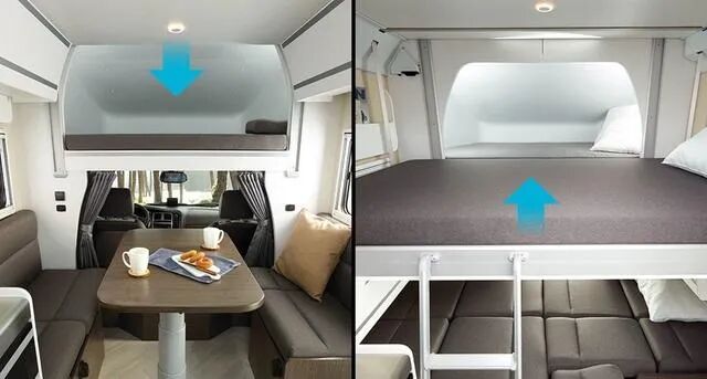 位于会客区顶部还提供了一张电动升降床,夜晚休息的时候可以把床位降下来,值得注意的是,床位还可以与驾驶室上方的额头床拼成一张超大尺寸的床位,提升日常使用的便利性和舒适性。