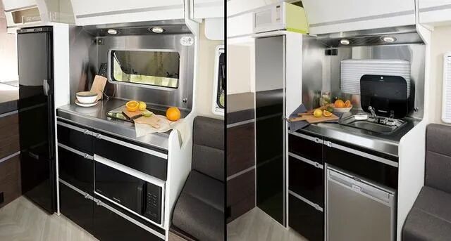 车内的厨卫区域位于车厢的中部,厨房提供了洗菜池、冰箱、橱柜等设施,想要在车内做饭的话需要自备一套便携式卡炉。