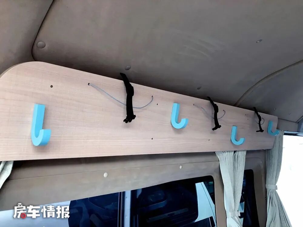 会客就餐区两边顶部还带有翻折的置物平台和挂衣钩,可以满足日常所需,提升整车的储物能力。