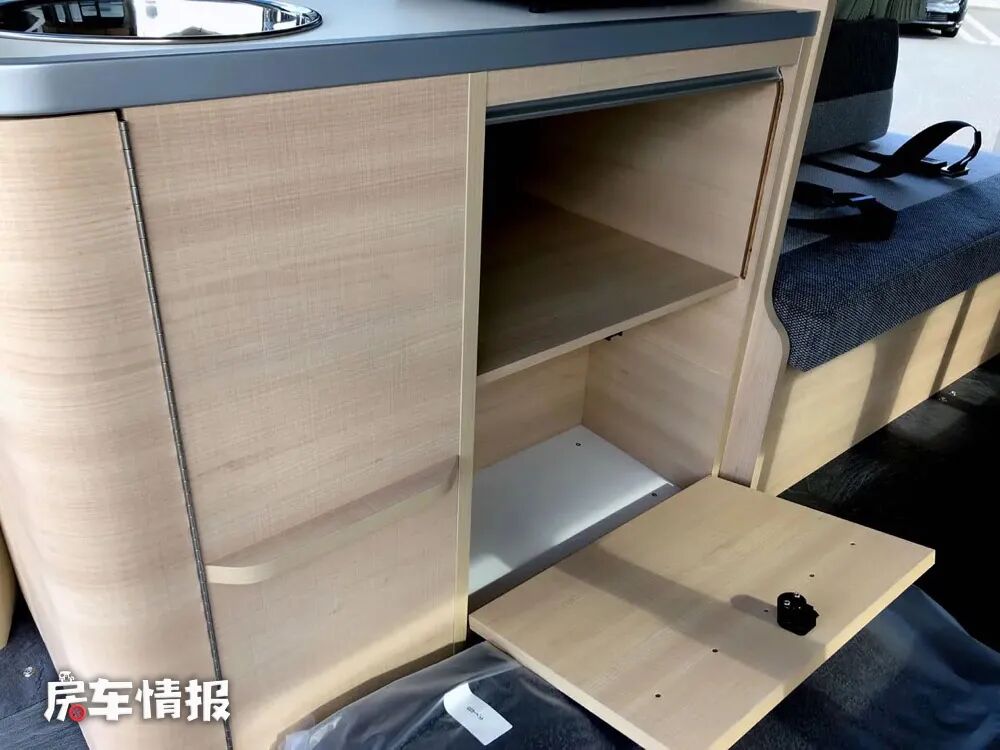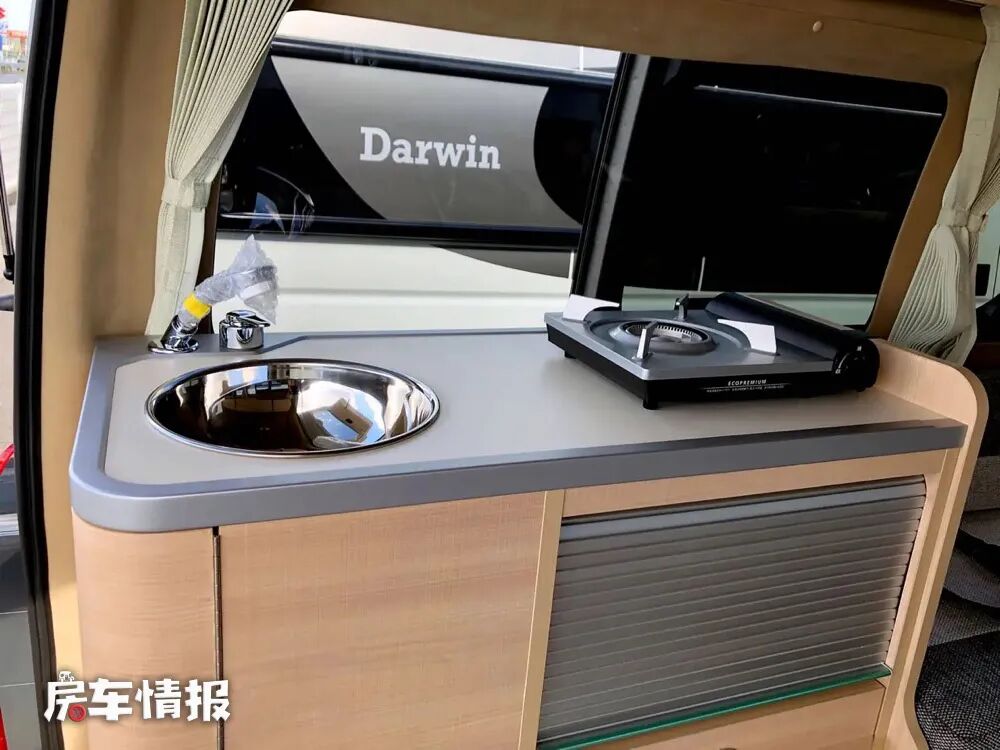 打开上翻式的后尾门可以看到位于车厢尾部一侧的厨房操作台,作为一辆露营车中的厨房区,这个操作台的面积已经非常不错了,上方不仅提供了不锈钢的洗菜池,还随车配备了卡式炉,下方的储物柜也可以存放一些烹饪所需的物品和材料,完全可以满足出行的基本烹饪和用餐的需求,而且洗手台盆还可以进行简单的洗漱。