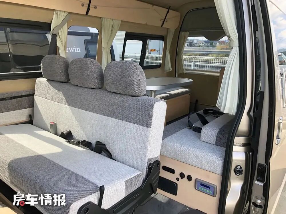另一侧则是一长排的无靠背座椅,驻车时也可以用来休息。晚上睡觉的时候,就可以将车内的沙发座椅相互拼接,组合成一张可以容纳三个人使用的简易沙发床,也能满足基本的睡眠休息需求。