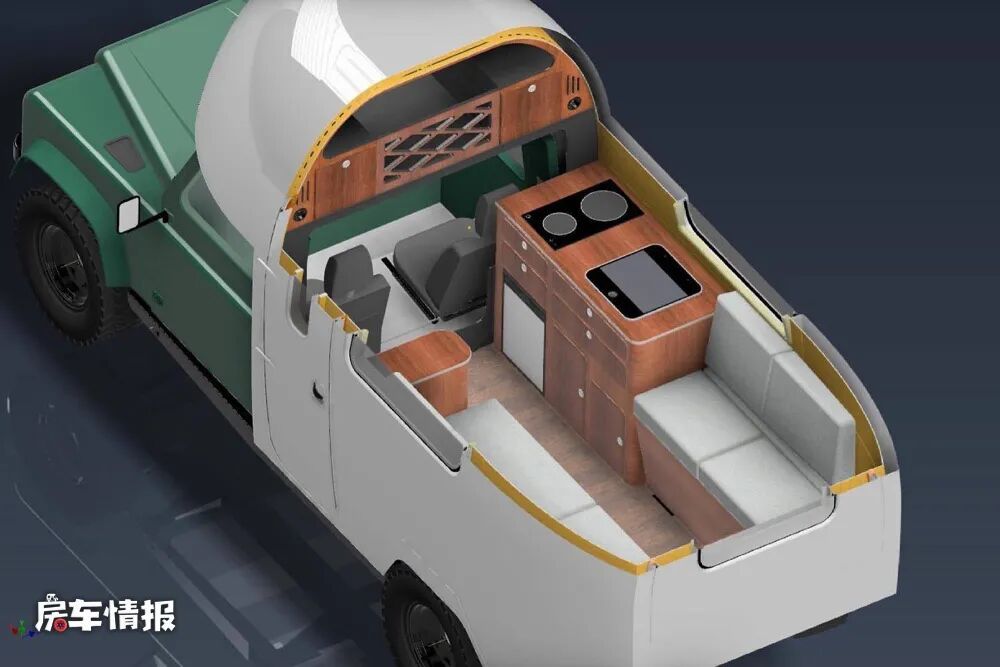 整个车厢采用左侧上门的设计,车厢内部带有包括了双孔灶台、翻盖洗菜池以及车载冰箱的厨房操作台,尾部则是对卡座式的会客区,晚上则可以变成可以容纳两个人使用的沙发床,另外在驾驶室上方的额头区域内也提供了额头床供临时应急使用,如果不需要平时也可作为储物空间使用。