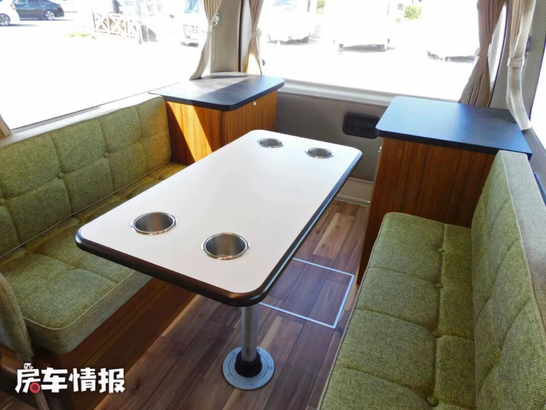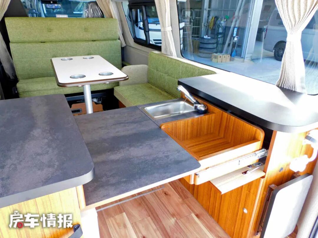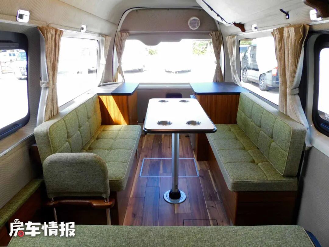 从车身左侧进入车厢内部,整体的生活区空间的装修风格还是挺复古的,原木色的家具搭配绿色的沙发看起来很有怀旧的感觉。车顶部还加入了一组十分有设计感的顶灯,为整车营造出了温馨的氛围感。