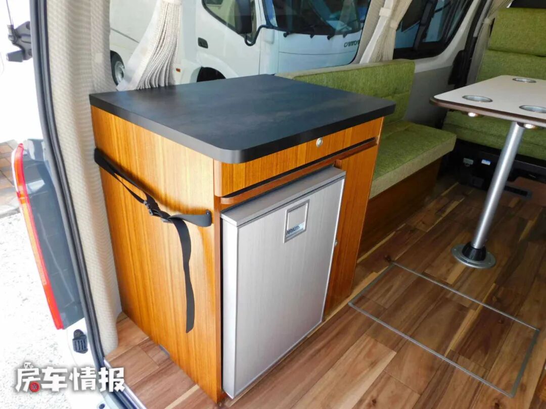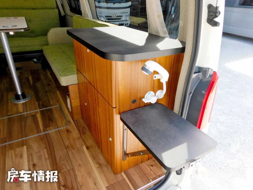 其中一侧是带有一台49L车载冰箱的平台,中间的夹缝处还隐藏了一张小桌板,另外一侧则是一组储物柜,同时储物柜外侧还配置了一个淋浴花洒,也能解决基本的洗漱需求。