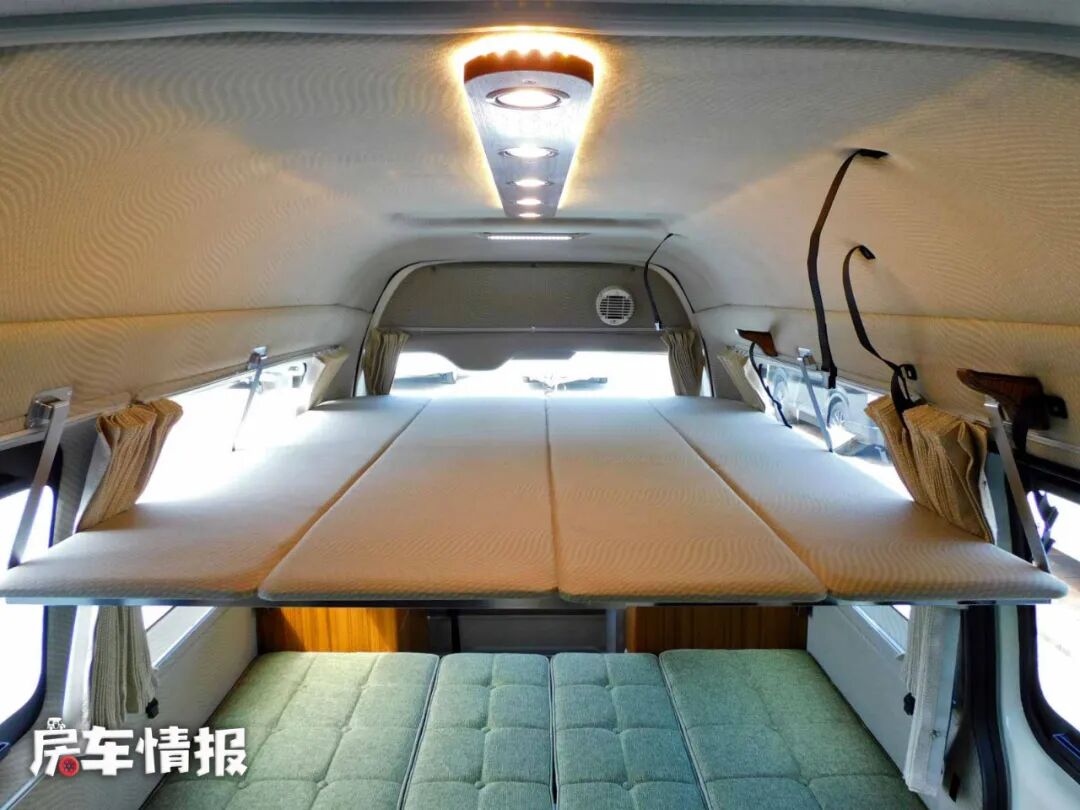 除此之外,这款车在顶部还隐藏了一张升降双人床,虽然整车的尺寸并不是很大,但是却提供了两张大床。