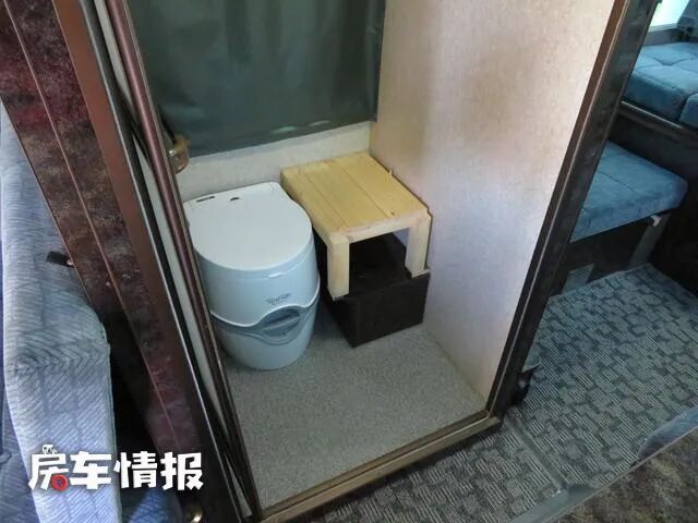 与之相对的是全车的独立卫浴室,不过内部的空间不是很大,但是一个人洗澡还是没问题的,提供了一台便携式马桶以及淋浴花洒,基础的洗漱需求还是能够满足的。