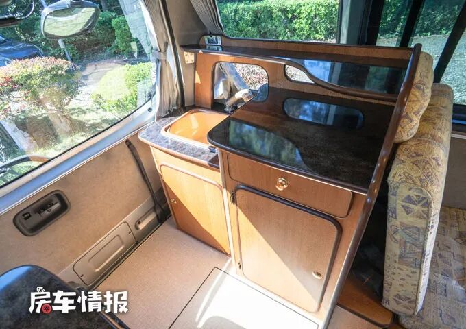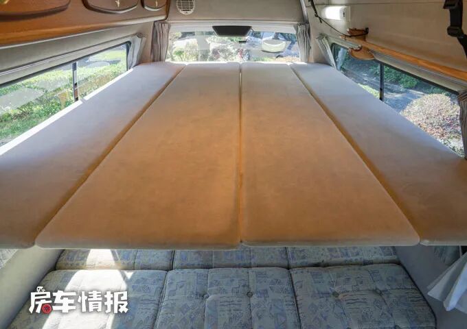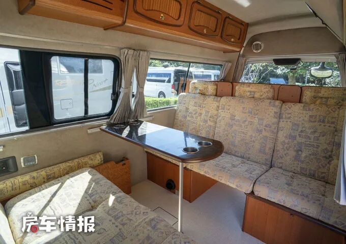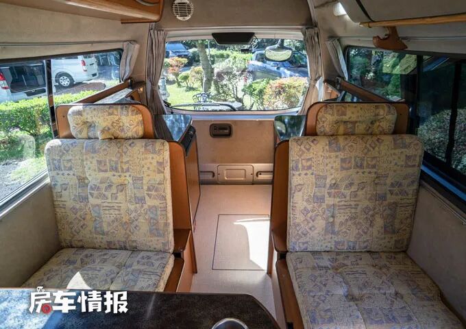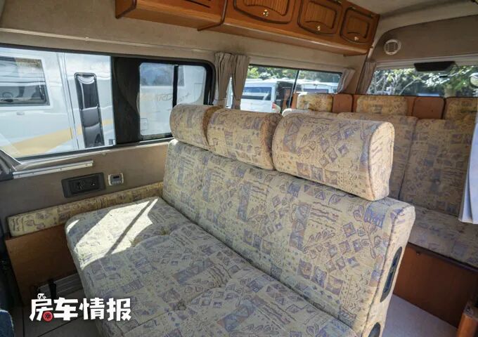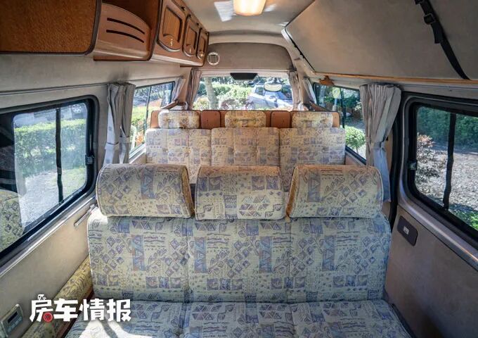 车厢内部保留了两排三人的乘客座椅,平时可以面向前方,相较于当下房车的乘用车级别座椅,这款车的座椅椅背比较直挺,长时间乘坐可能会带来不适感。