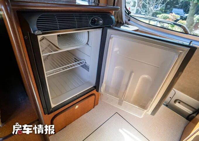 车尾部一侧是一组上下错落的柜体,其中还嵌入了一台40L单开门的车载冰箱,可以存放基础的食物。