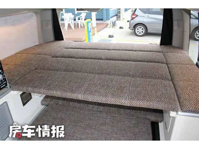 到了晚上,可以将前方两排乘客座椅放倒,与后方的床垫相互结合成一张通铺,同时两侧柜体上方还可以搭建一个简易的双人床铺,一共可以满足四个人的睡眠需求。