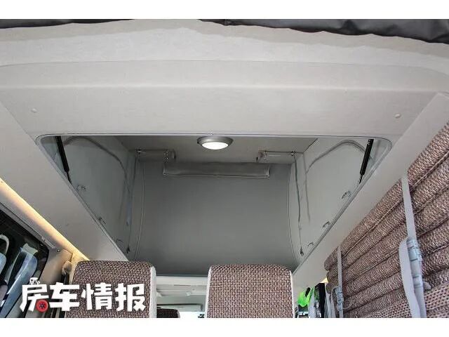 除此之外,在顶部的升顶机构内还提供了一张双人床,一辆不到5米长的床车,最多可以容纳六个人使用。