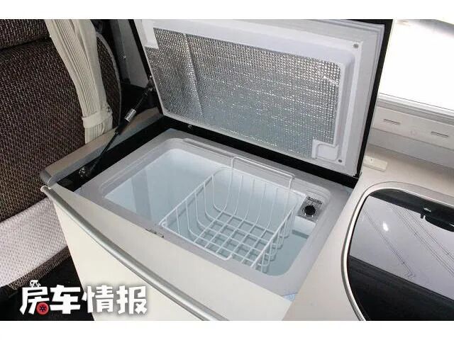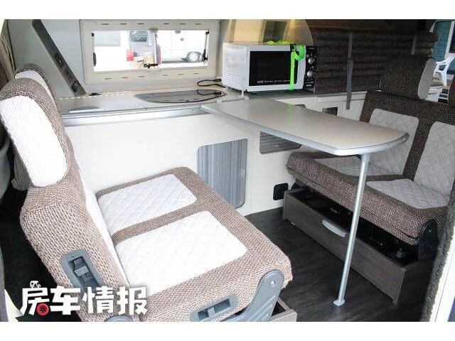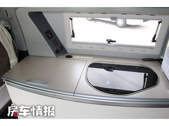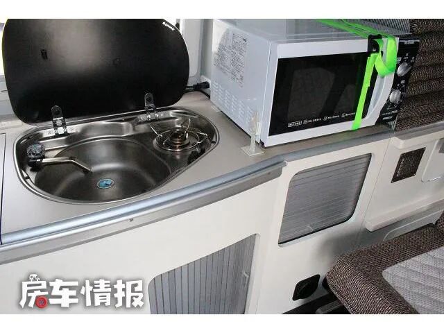 靠近右侧乘客门的是全车的厨房区,采用了前后贯通的厨房操作台,台面上提供了带盖的不锈钢洗菜池以及单孔燃气灶,旁边还放置了一台微波炉,左侧桌面下还隐藏了一台上翻盖的车载冰箱,可以解决旅行途中的烹饪需求。