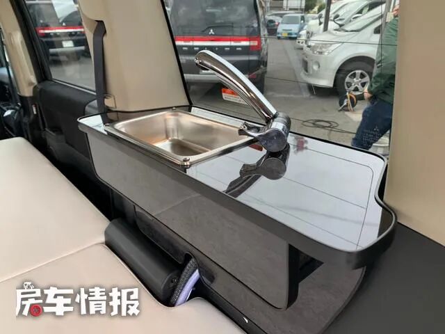 右侧则是提供了一个小型的洗手台盆,既可以简单的冲洗瓜果蔬菜,也可以满足简单的洗漱,搭配卡式炉,也能简单的做饭煮面。