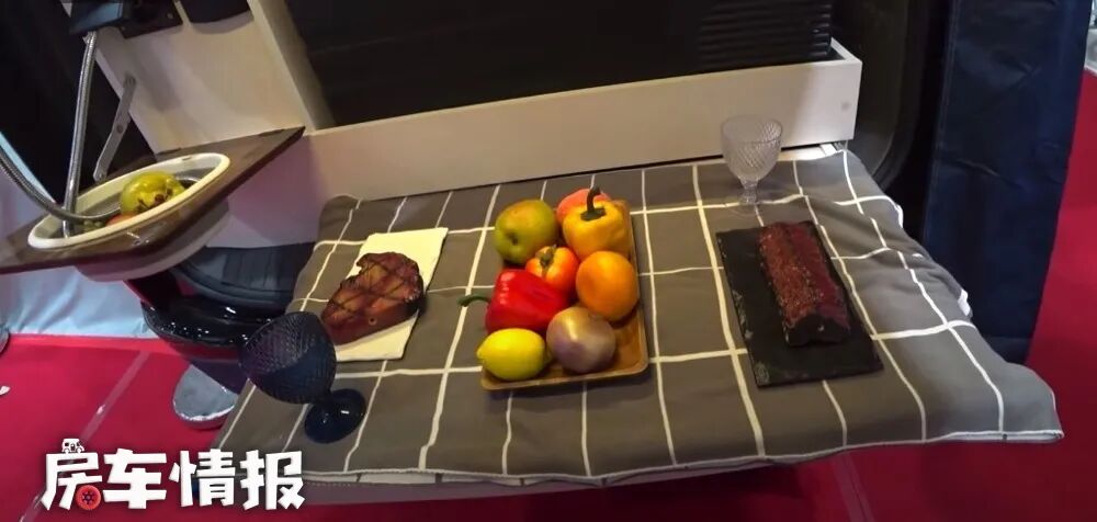 全车的厨房区位于车厢尾部,打开后尾门可以看到整个厨房区包含车载冰箱、可折叠的水槽、淋浴花洒等,因为带有一个可向外抽拉的餐桌,所以后期也可以加装便携式的炉灶,满足基本的烹饪需求。