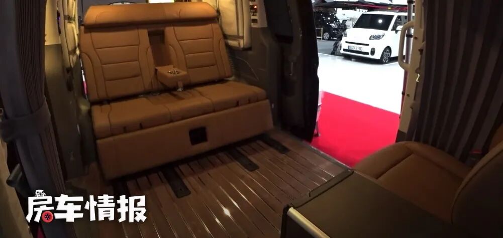 那这款实际的车型又是如何改造的呢?首先是车内的整体氛围感,采用了深棕色的配色,给人感觉十分豪华,前方主副驾驶座椅也带有可向后旋转的功能。车厢内的第二排乘客座椅则设计的更加奢华舒适,座椅带有按钮,平时只需要按下按钮,就可以将座椅放平。