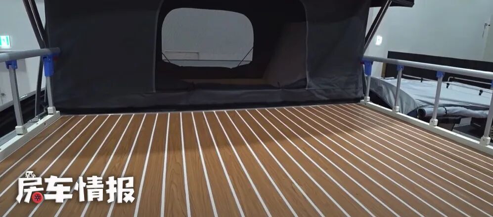 除去下方的沙发床之外,这款露营车在顶部也加入了升顶的平台,和我们常见的比较单一的升顶机构不同的是,这个升顶是使用剪刀式的升降系统,打开后不仅可以提升整个车内的高度,而且还可以变成一个顶置的观赏平台,周围还配备了安全护栏,平时既可以通过户外的楼梯进入也可以从内部进入。天气好的时候可以坐在平台上享受个人的休闲时光,平台下方还带连接了一个辅助帐篷,也可以作为独立的卫生间使用,以满足更多的日常生活需求。当行车时需要将其收起,支腿和安全护栏也可以很好的折叠收至到车顶部。