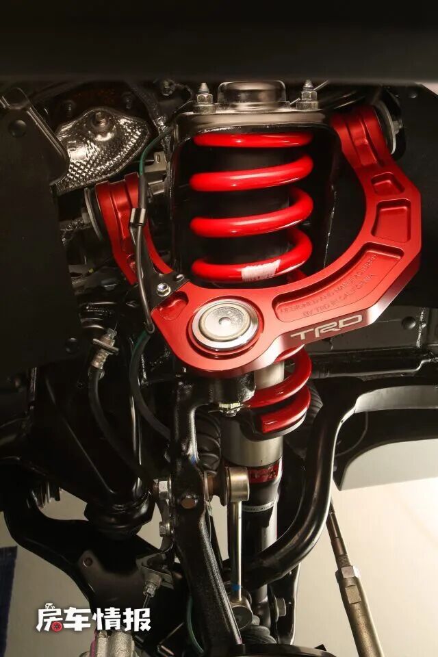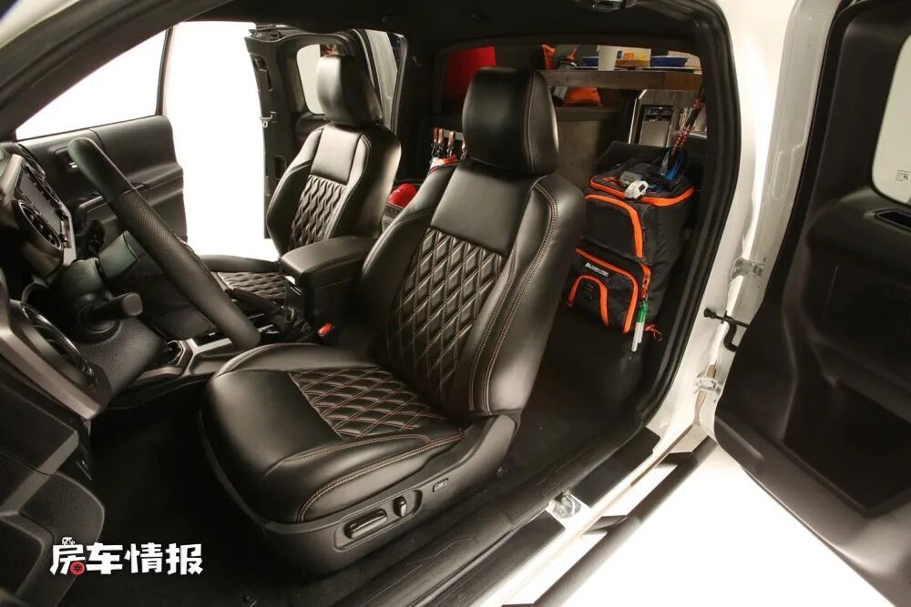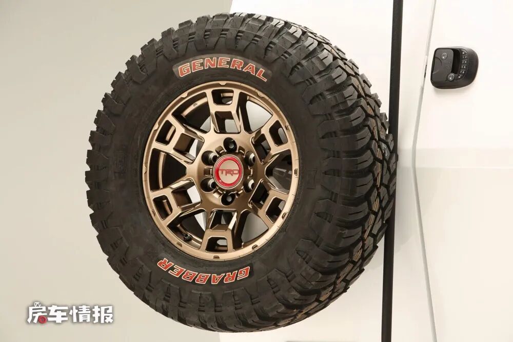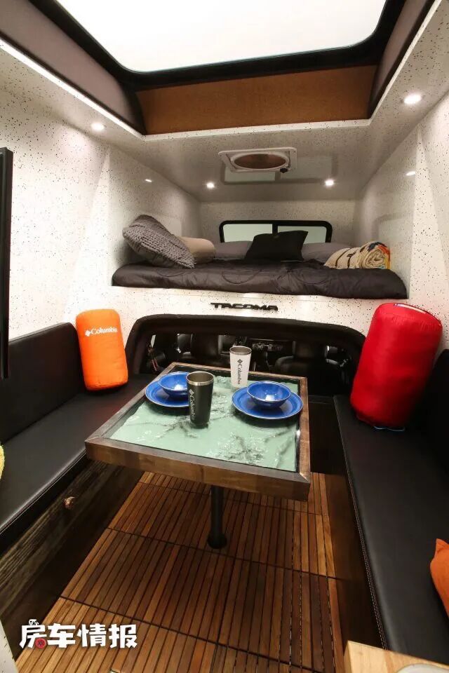 首先在底盘方面,这款房车是基于丰田Tacoma TRD Sport皮卡底盘所打造的,作为一辆4X4的皮卡房车,其搭载了一台3.5L的V6发动机,匹配6速手动挡变速箱,最大马力可达278匹,可谓是动力十足,另外全车采用的是General Grabber X3 285/70/17的轮胎、为整车提供强大的抓地力,并配备了刚性辅助照明,以及前绞盘、2英寸悬挂升降机和TRD钢坯上的控制臂等,足以保证全车的越野性能,同时贼车辆前方机器盖上还带有TRD的呼吸管,不仅可以帮助整辆车通过水呼吸,另外也使整辆车的外观看起来更加的炫酷。