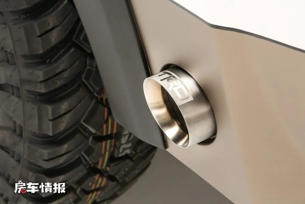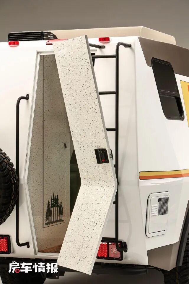 因为全车使用了后上门的设计,所以这款房车的排气管也被移至到了车辆的侧面,同时车厢尾部不仅配备了外置备胎,还带有爬梯,可以方便后期登车检查,车顶则提供了一个超大尺寸的天窗,既提升了整车的设计感,同时又能够保证车内的整体采光度。