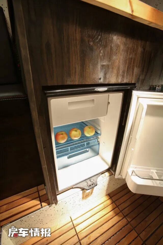 乘客门左侧是全车的厨房区域,配备了比较齐全的烹饪设施,包括燃气灶、水槽和冰箱等,满足日常的烹饪需求。