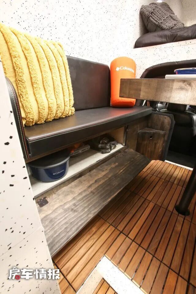 在最前方的驾驶室顶部的额头区域内,提供了一张额头床,大小尺寸可以容纳两名成年人使用,同时前方还带有大尺寸的观赏窗,也保证了此区域的采光度,顶部还配置了一个换气扇,保证车内的空气清新。