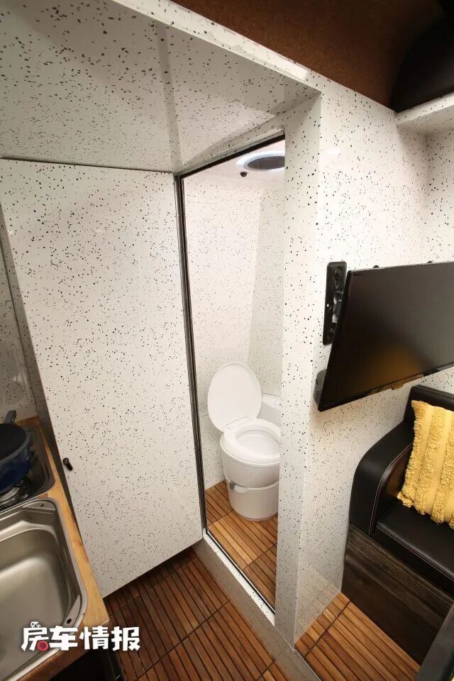 而另一侧则是全车的卫浴室,设有马桶、淋浴花洒等设备,出行在外的洗漱需求也完全可以解决。
