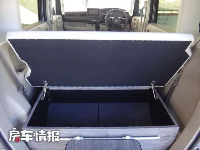 有人会疑惑那全车一点储物空间也没有吗?其实不然,尾部的床板是可向上翻折打开的,打开就可以看到下方的储物空间,存放一些基本的生活物品还是没问题的。