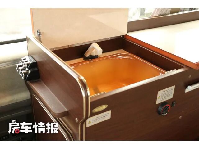 电路上,这款房车并没有搭载逆变器,只是提供了一块副电池,并在车内提供了三个充电插口,方便平时外接其他小电器使用,水路上也配置了净水箱和灰水箱,满足日常所需。