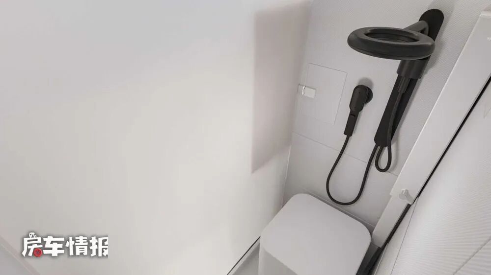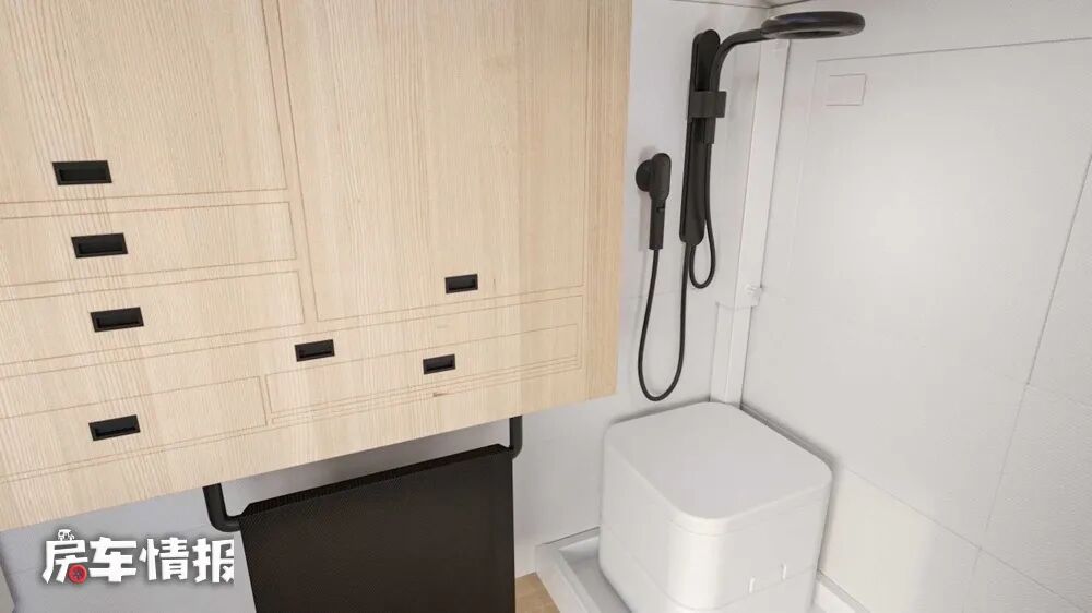 车厢尾部平时的状态是一张双人沙发,而沙发下面则隐藏着一个便携式的马桶,上方则配置了一个淋浴花洒,后期需要洗漱的时候,将沙发移走,拉上隐藏门就可以进行基础的洗漱了。