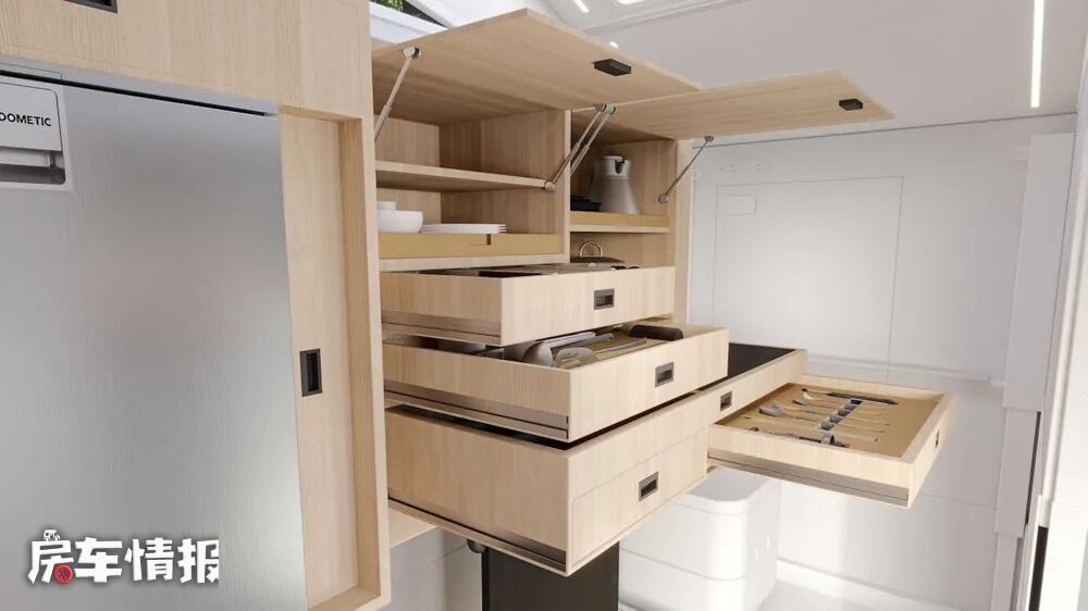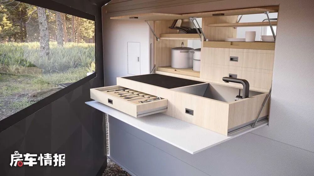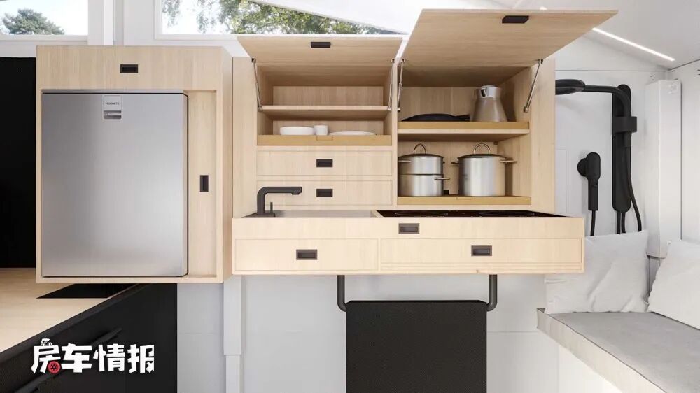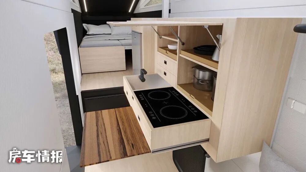 双人床后方为一个集储物和烹饪二合一的区域,最内侧是一台小型的车载冰箱,后方则是大量的储物空间,下方还带有一个可以抽拉的厨房操作台,并配置了水槽和电磁炉,需要做饭的时候就可以打开用来烹饪了,平时不使用时为收起的状态,也不占用整个内部的空间。