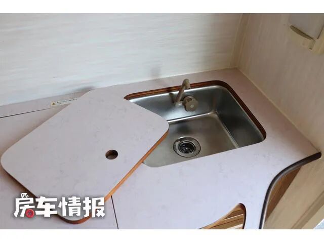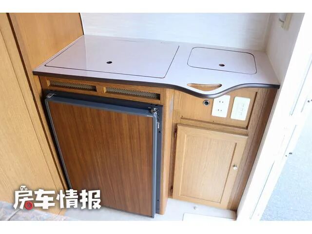 位于车厢尾部刚上门处的是全车的厨房区,台面上也带有带盖的不锈钢洗菜池和带盖的燃气灶,下方则嵌入了一台车载冰箱,也可以满足基础的烹饪需求,另外侧面还提供了电源接口,也能外接其他厨用电器以满足更丰富的生活。