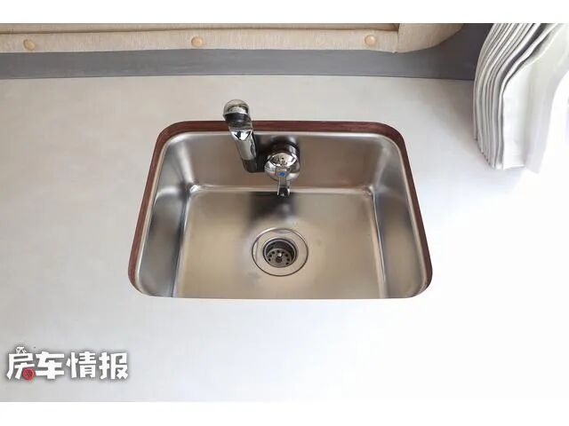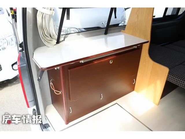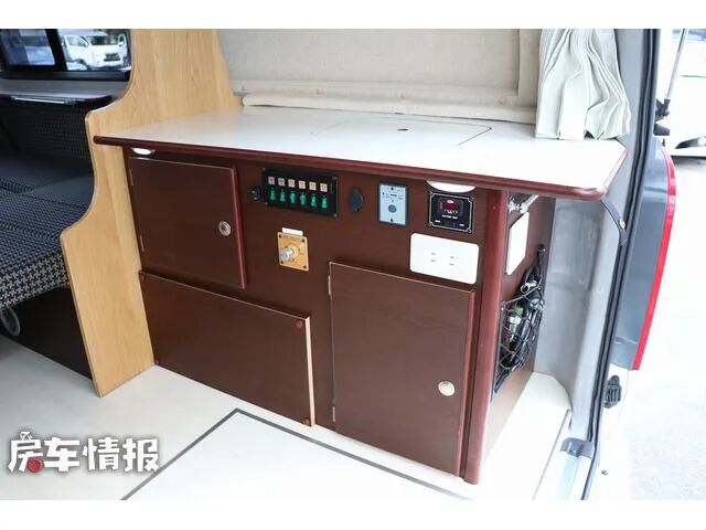 车厢尾部并不是单纯的与前方会客区分开,而是增加了分隔挡板,使车内的布局更加清晰。一侧是带有隐藏式洗菜池的厨房操作台,后期搭配卡式炉可以完成基本的烹饪要求。