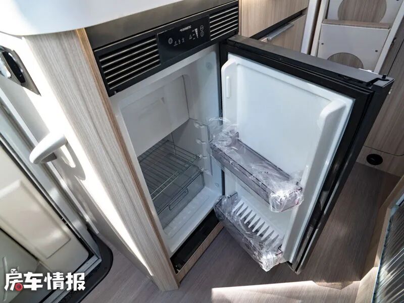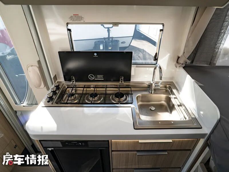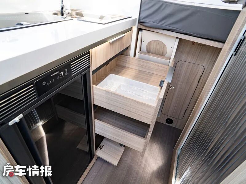 全车的厨房区位于乘客门后方,整体的面积还是比较中规中矩的,台面上方提供了翻盖的三孔燃气灶,旁边则配置了一台不锈钢电磁炉,台面下方则提供了一台嵌入式的70L的车载冰箱,同时厨房区还配置了大量的储物空间,足够存放平时使用的厨用工具。