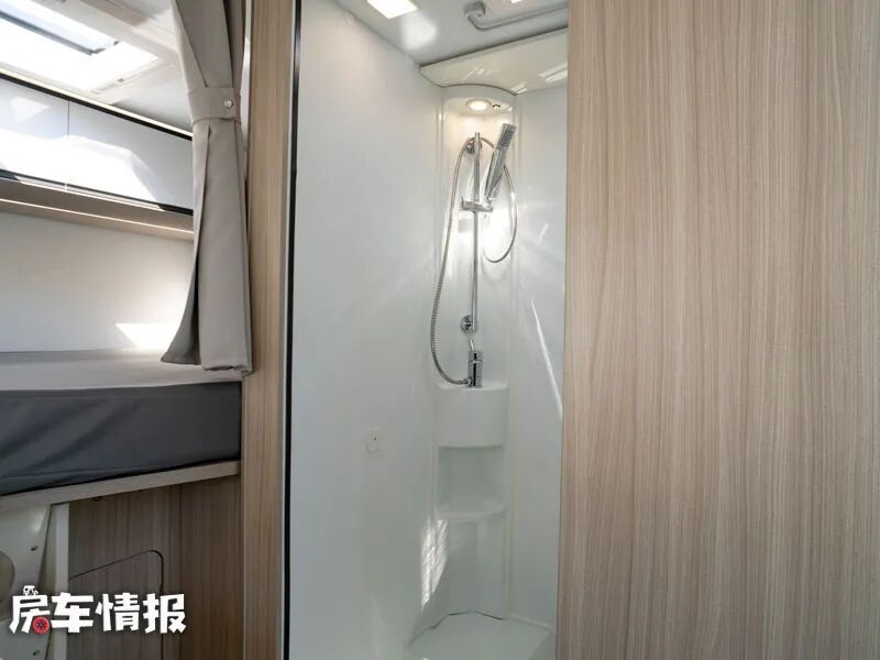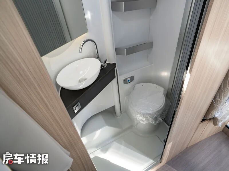 厨房操作台对面则是一间带有推拉门设计的独立卫浴室,相比整体的车厢宽度,内部的空间还是不错的,采用了可翻转的转角式的洗手台盆,上方则提供了大尺寸的梳妆镜,淋浴花洒则隐藏在后方,不仅更加节约了面积,而且还可以达到干湿分离的效果,旁边一侧则是马桶和置物架,满足基本的洗漱需求。