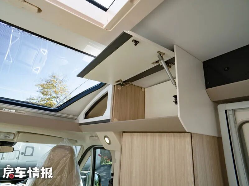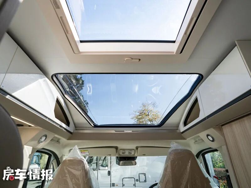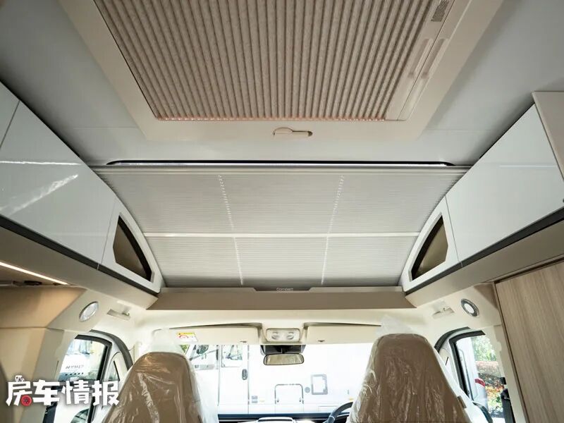 车内整体感觉十分通透,而这样良好的采光度得益于车厢前方顶部的两块大尺寸天窗,提升了车内的整体通透性。天气好的时候也可以打开后方的天窗进行换气,晚上需要的时候就可以拉上隐私帘,以保证得到一个私密安静的睡眠空间。