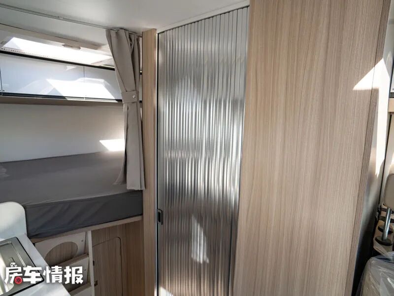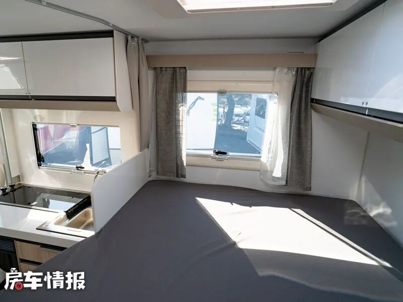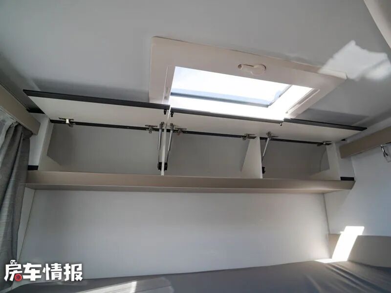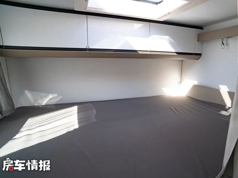 最后是位于车厢尾部的横置双人床,其尺寸可达到1950*1400mm,足以睡下两个成年人,顶部和侧面都带有天窗,能够保证整体的采光度,另外也提供了可以存放衣物的储物柜,满足日常所需。