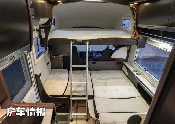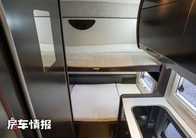 最后是位于车厢尾部的休息区,采用的是横置上下床的设计,上下各可以睡一下一名成年人,同时还带有采光通风的窗户,保证整体的通透性。同时上床还带有可翻折的设计,可以为下床预留出更多的空间。