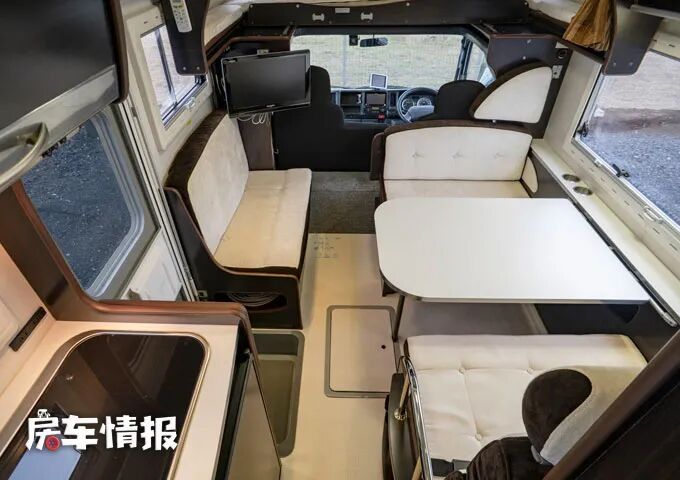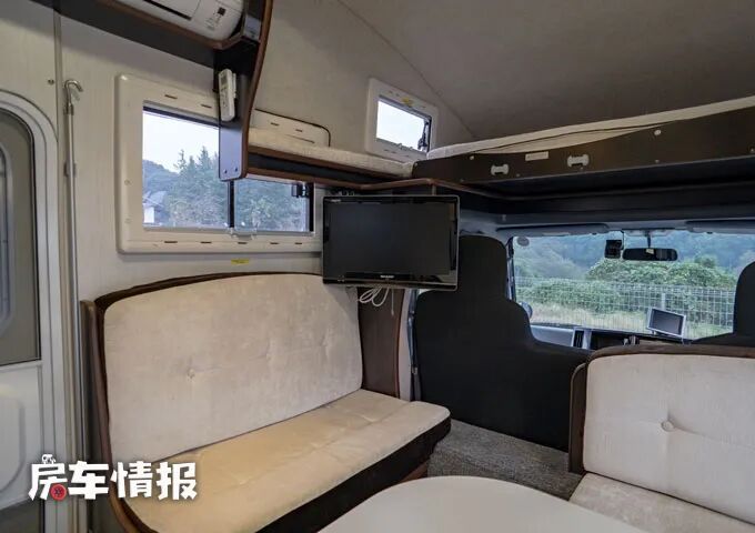 全车的会客区是使用了经典的四人对卡座沙发+超大尺寸餐桌的设计,而在乘客门前方也设立了一组沙发,所以驻车时,整个会客区最多可以容纳6个人使用,同时副驾驶后方的墙壁上还带有一台19英寸液晶电视,能够为旅行生活提供最基础的娱乐项目。