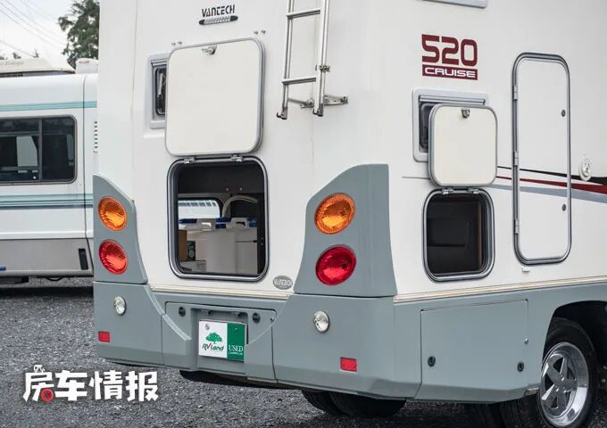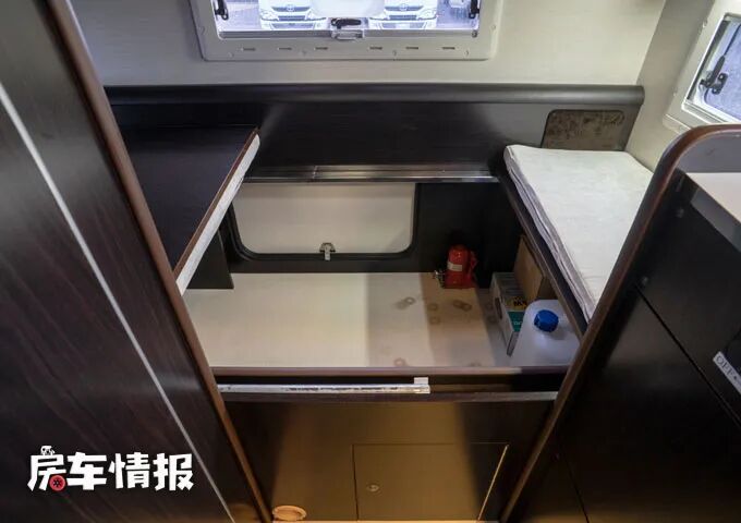 因为整辆车内部是和外部的储物舱相通的,所以打开下铺的床板就可以看到车厢尾部的储物舱,从车内就可以拿去行李还是非常方便实用的。