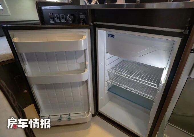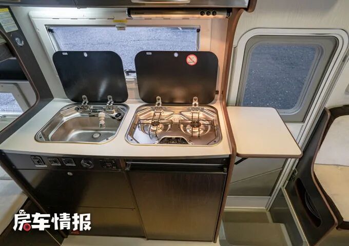 位于乘客门后方的是全车的厨房区,整体的配置也很丰富,包括厨房操作台台面上提供的翻盖不锈钢洗菜池以及翻盖的双孔燃气灶,顶部还配置了一台抽油烟机和一台微波炉,侧面也提供了可拓展的小桌板方便后期用来备菜,下方则嵌入了一台90L的车载冰箱,足以满足平时的烹饪需求。