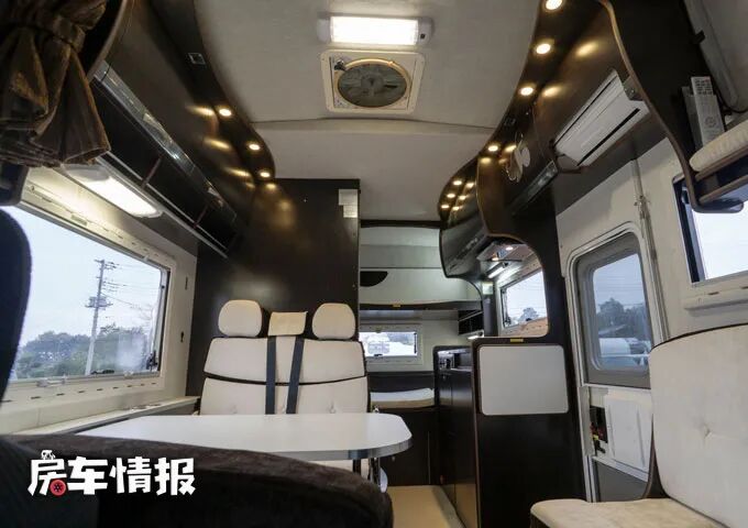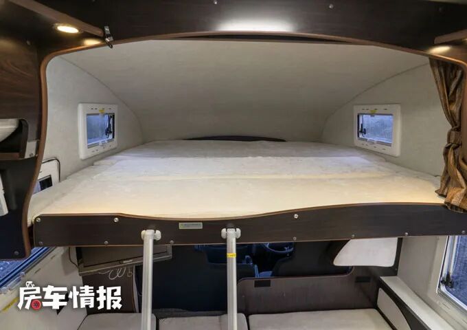 晚上需要休息的时候,就可以将对卡座沙发相互拼接组合成一张沙发床,另外在驾驶室上方的额头区域内,也标配了一张双人床,并带有可拓展功能,足以躺下两名成年人,两边还带有小型的外推窗,提升整体的采光度。