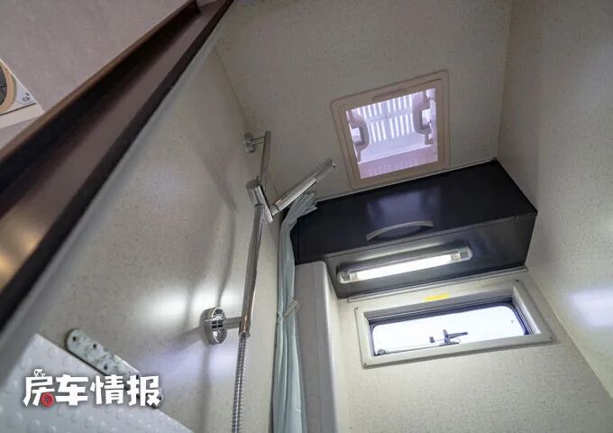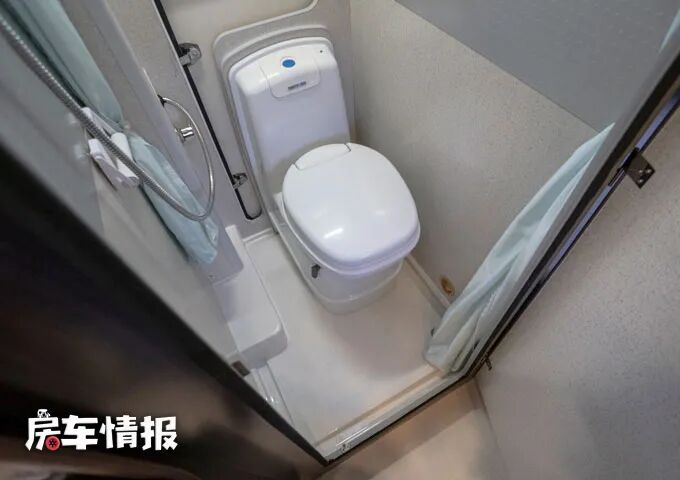 另外这款房车还提供了一间独立的卫浴室,在会客区后方,内部提供了基本的马桶和淋浴花洒,满足基本的生活所需。