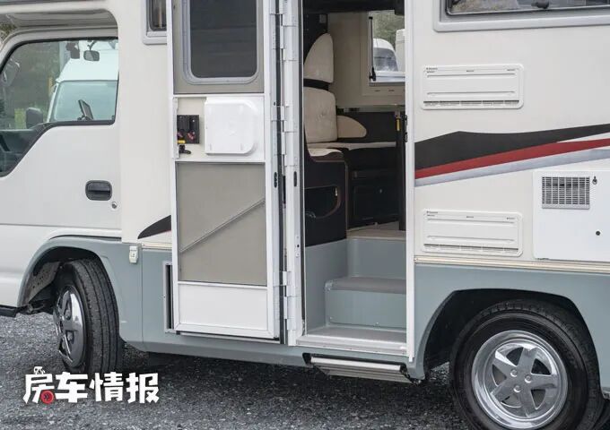 全车采用白色和蓝色的配色,造型也使用了日本主流轻卡房车的设计,车身外部不仅提供了遮阳棚、水电接驳口,还在尾部设置了一个贯通式的储物舱,满足日常储物的需求。