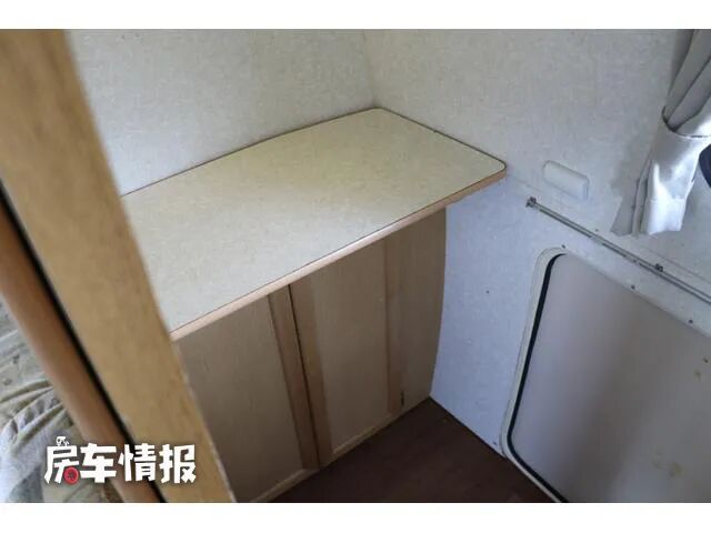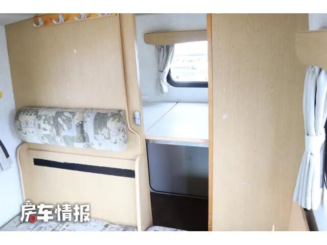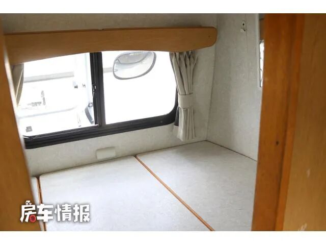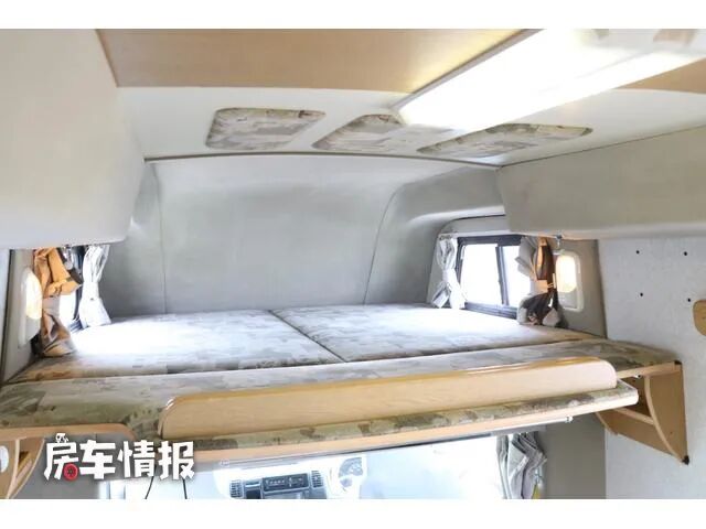 另外在前方驾驶室顶部还提供了一张可折叠的床铺,打开之后尺寸约为1830*1650mm,也能为三个人提供睡觉休息的地方,同时两边还配置了外推窗,保证了此区域的采光和通风。