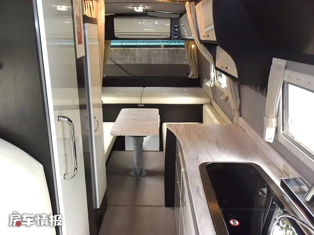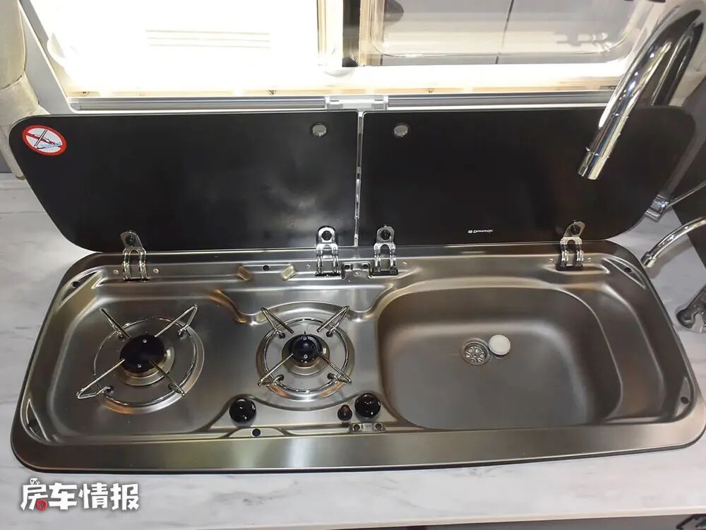 乘客门后方是全车的厨房区,厨房操作台的面积还是很可观的,上方带有翻盖的不锈钢水槽以及双孔燃气灶,完全可以解决日常的烹饪需求,另外旁边的空置区域还可以后期加装其他的厨用小电器,以丰富旅居生活。