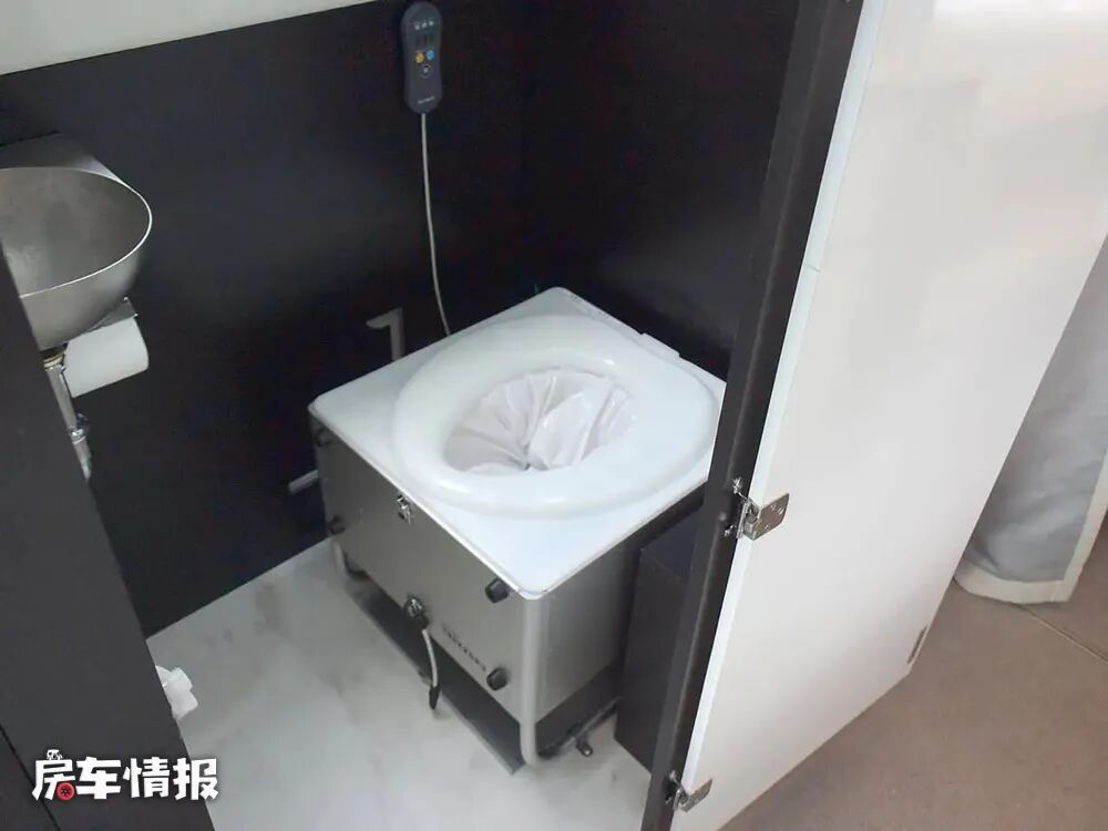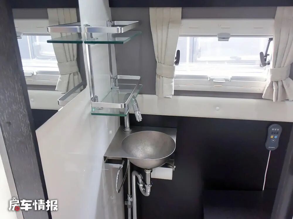 与之对面的是全车的独立卫浴室,内部提供了比较齐全的洗漱设施,包括小型的洗手台、置物架、马桶、淋浴花洒等,完全可以满足日常出行的洗漱需求。