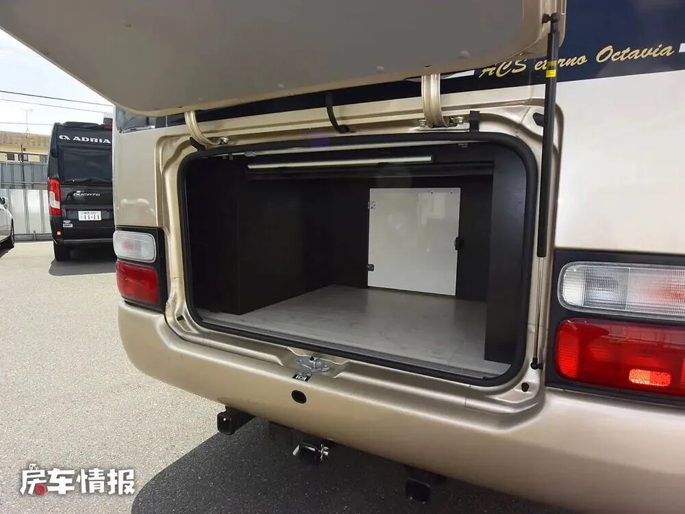 全车的外观造型上并没有什么特别亮眼的设计,但是在车身左侧加入了遮阳棚,这样也可以保证天气好的时候在车外休息吃饭。车身左右两侧的后方生活区均采用了盲窗的设计,可以保证内部的隐私,同时在车厢尾部还有一个可以贯通到内部的储物舱,天气不好的时候也可以在车内拿取行李。