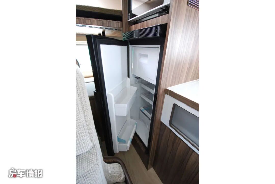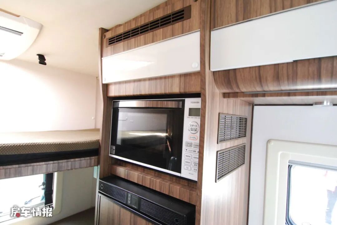 后方则是冰箱和微波炉,以及顶部的多个储物柜,不仅可以丰富日常的烹饪需求,还可以存放一些随身携带的物品。