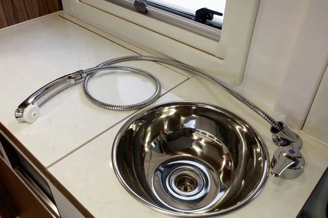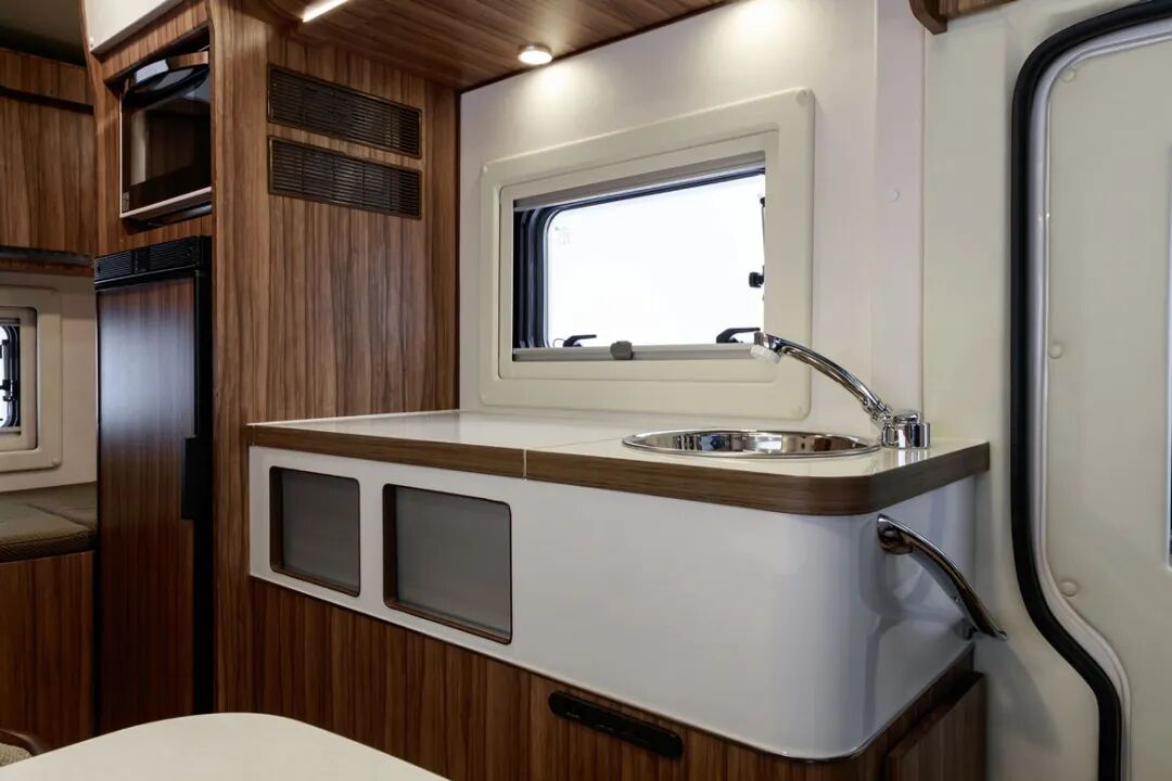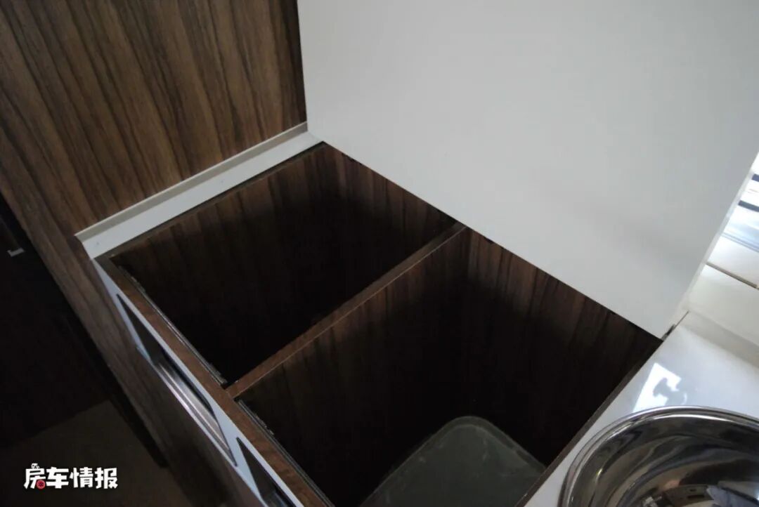 乘客门后方的厨房区域空间还是比较客观的,大尺寸的台面上方带有不锈钢洗菜池,旁边后期可以增加一台卡式炉或者便携式微博,满足基本的烹饪需求,翻起桌板可以看到下方大空间的储物格,放置一些碗筷和食材还是足够的。